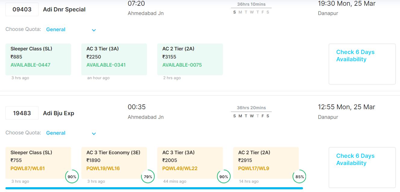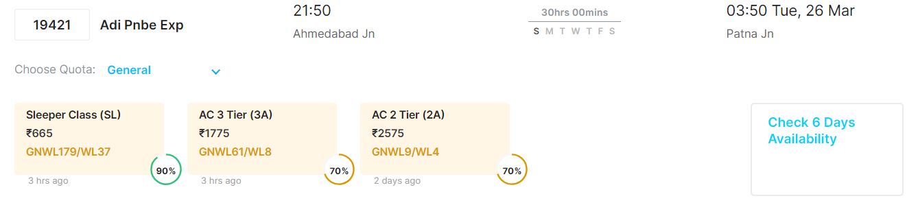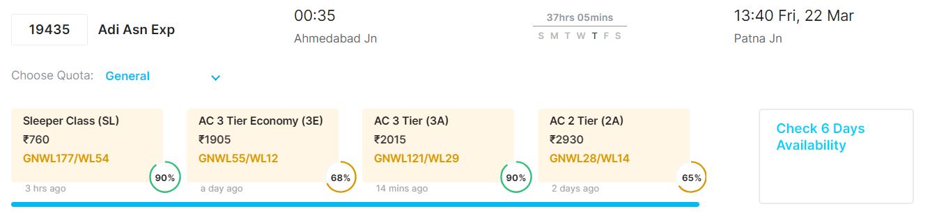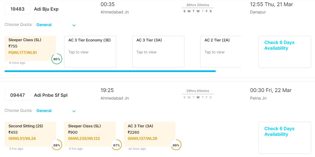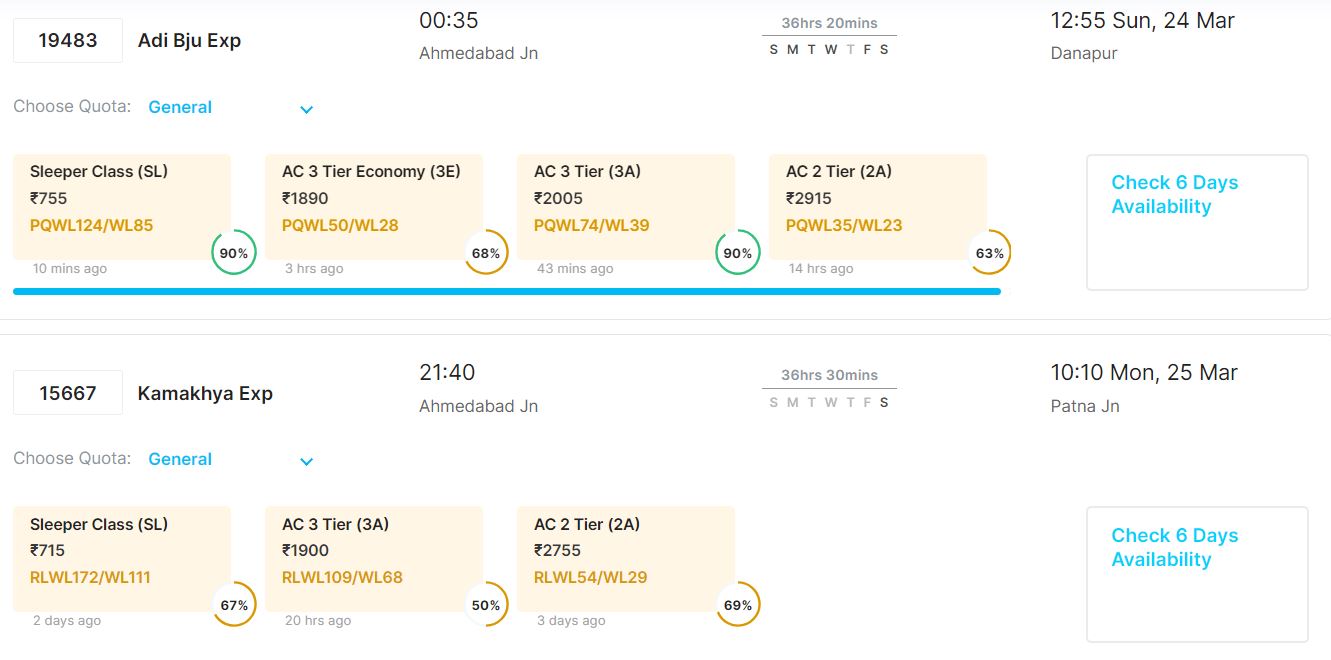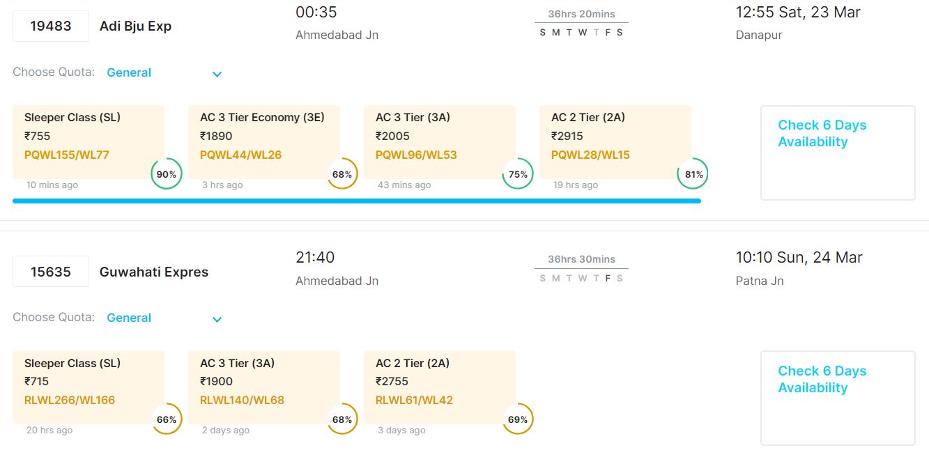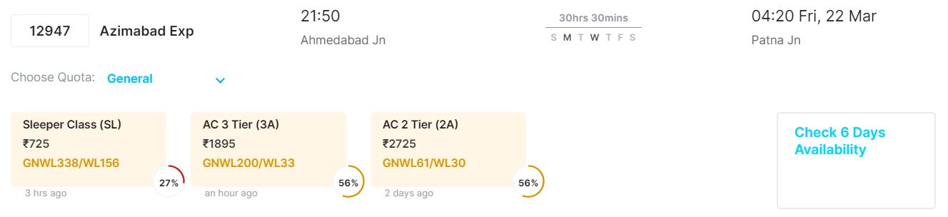 आपकी सुविधा का ख्याल रखते हुए 20 मार्च से 24 मार्च तक अहमदाबाद से पटना जाने वाली ट्रेनों में वेटिंग की वर्तमान स्थिति के बारे में हम बताने जा रहे हैं।