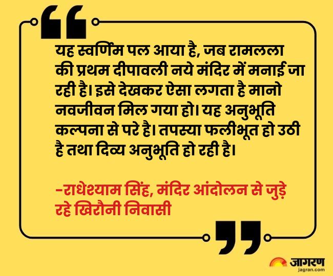 मंदिर आंदोलन से जुड़े रहे खिरौनी निवासी राधेश्याम सिंह कहते हैँ कि बड़ी प्रतीक्षा के बाद यह स्वर्णिम पल आया है, जब रामलला की प्रथम दीपावली नये मंदिर में मनाई जा रही है। इसे देखकर ऐसा लगता है मानो नवजीवन मिल गया हो। यह अनुभूति कल्पना से परे है। तपस्या फलीभूत हो उठी है तथा दिव्य अनुभूति हो रही है।