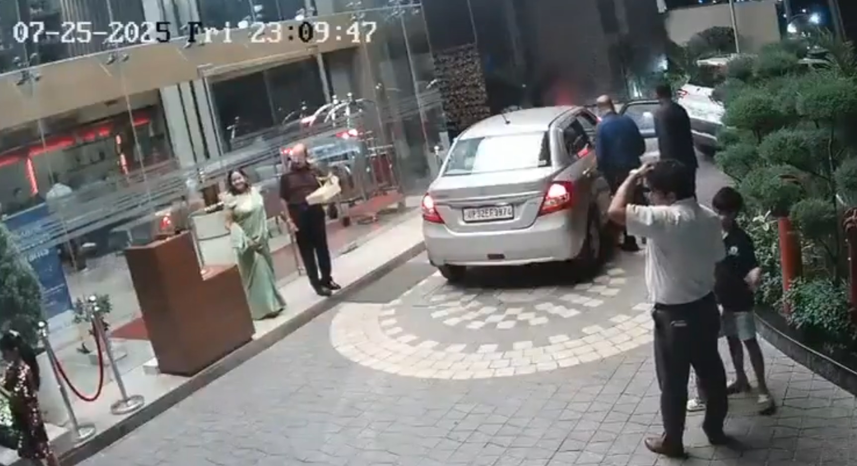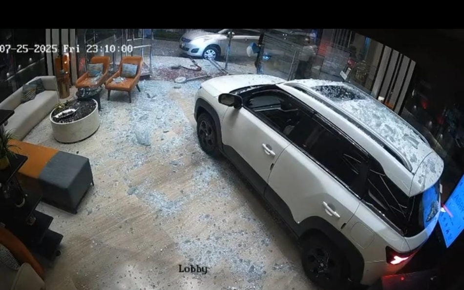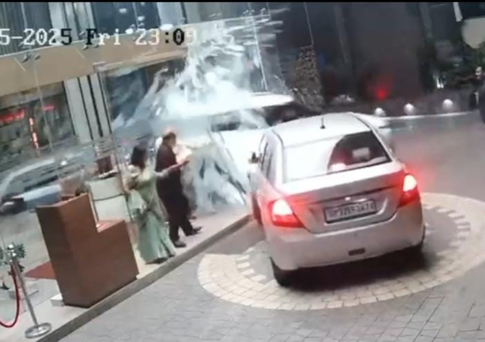 कार स्टार्ट करने के बाद ब्रेक लगाने की जगह एक्सीलेटर दबा दिया जिससे कार बैक गियर में अनियंत्रित हो गई और होटल के मुख्य गेट के शीशे तोड़ते हुए होटल के अंदर रिसेप्शन तक जा घुसी।