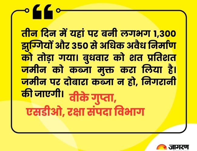 रक्षा संपदा विभाग के एसडीओ वीके गुप्ता ने बताया कि तीन दिन में यहां पर बनी लगभग 1,300 झुग्गियों और 350 से अधिक अवैध निर्माण को तोड़ा गया। बुधवार को शत प्रतिशत जमीन को कब्जा मुक्त करा लिया है। जमीन पर दोबारा कब्जा न हो, निगरानी की जाएगी। यहां पर चारदीवारी का प्रस्ताव बनाया है। जमीन पर पौधारोपण करने की भी योजना है।