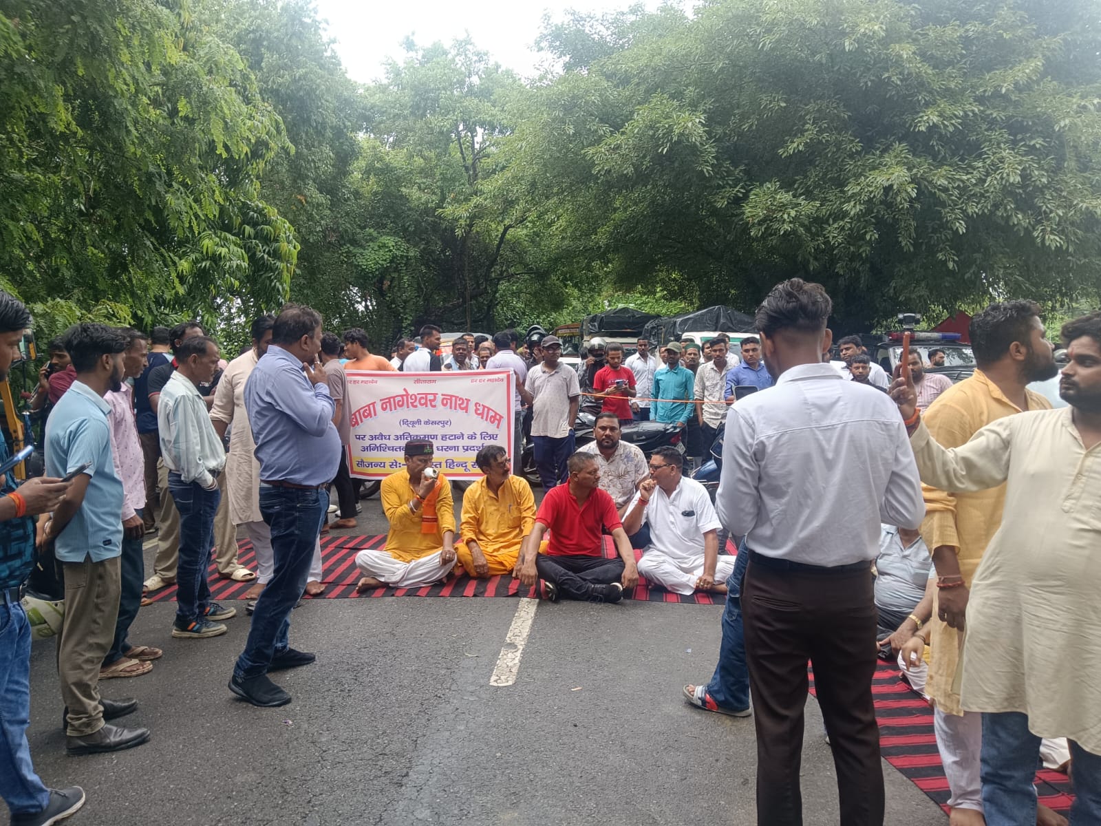 प्रदर्शनकारियों ने आरोप लगाया कि कालोनी विकसित कर रहे एटू जेड इंफ्रा प्राइवेट लिमिटेड के स्वामी ने प्राचीन बाबा नागेश्वरधाम मंदिर के मुख्य मार्ग को ट्रांसफार्मर रखकर बंद कर दिया है।