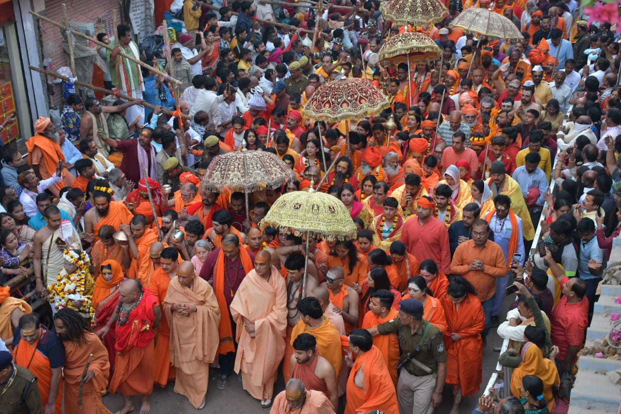 शोभायात्रा का नेतृत्व अखाड़ों के आचार्य महामंडलेश्वर कर रहे हैं। 11 बजे महानिर्वाणी के नेतृत्व में तीन अखाड़ों ने निर्वाणी घाट पर स्नान ध्यान कर शोभायात्रा निकाला। संन्यासियों के लिए मंदिर का गेट नंबर चार दोपहर दो बजे तक आरक्षित कर दिया गया है।