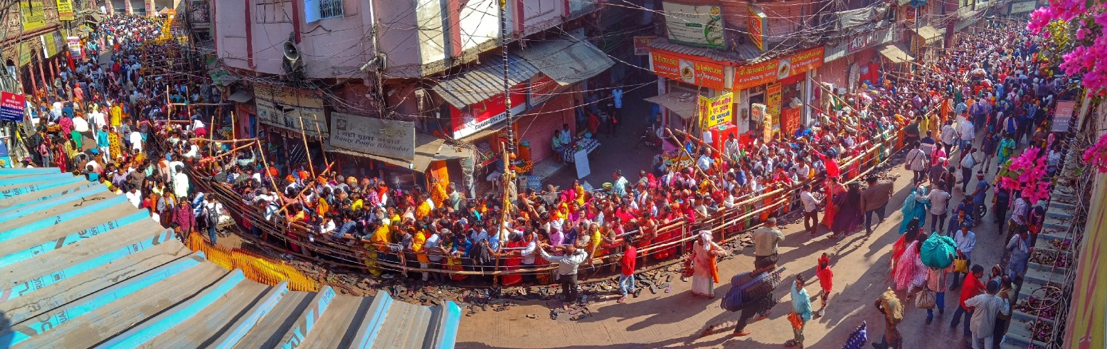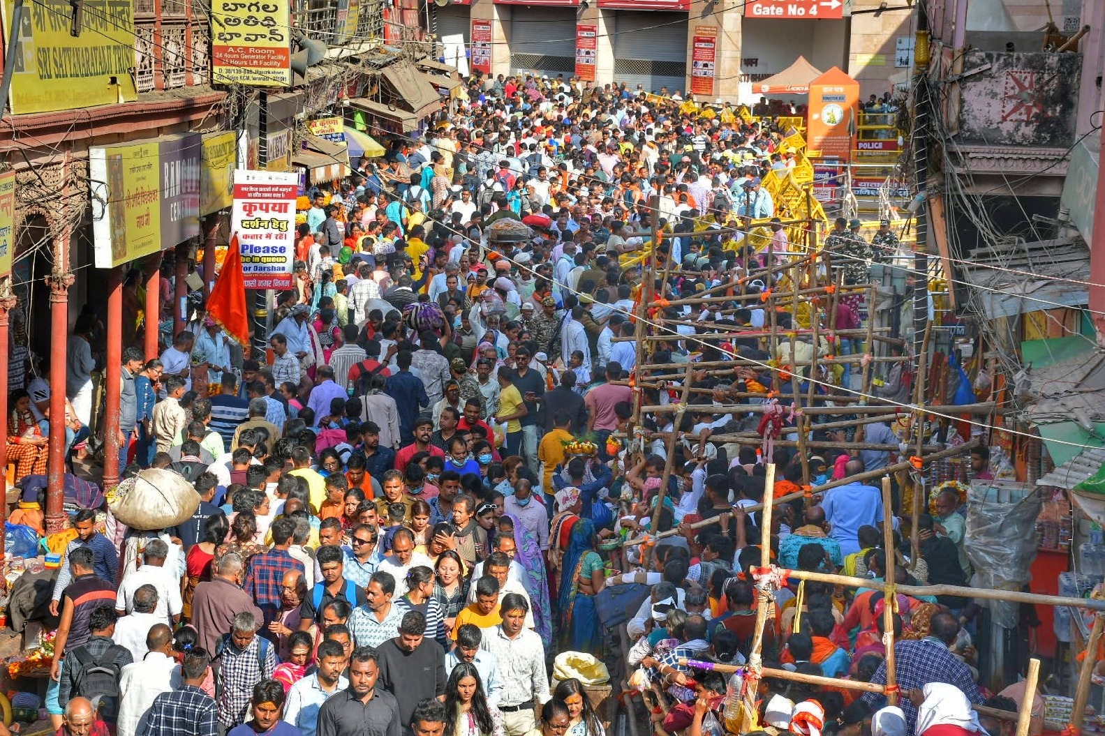 श्रीकाशी विश्वनाथ मंदिर में दर्शन के लिए गोदौलिया-चौक मार्ग पर कतारबद्ध श्रद्धालु। उत्तम राय चौधरी