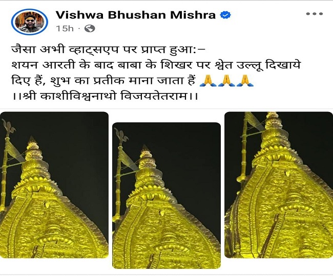 इस घटना की जानकारी श्री काशी विश्वनाथ मंदिर ट्रस्ट के मुख्य कार्यकारी अधिकारी (सीईओ) विश्व भूषण मिश्र ने अपने फेसबुक अकाउंट के माध्यम से साझा की। उन्होंने लिखा है कि "जैसा अभी व्हाट्सएप पर प्राप्त हुआ, शयन आरती के बाद बाबा के शिखर पर श्वेत उल्लू दिखाए दिए हैं, जो शुभ का प्रतीक माना जाता है। श्री काशी विश्वनाथो विजयतेतराम।"