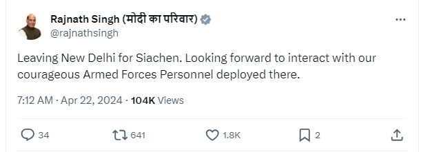इस बीच, रक्षा मंत्री राजनाथ सिंह सोमवार को सियाचिन के लिए रवाना हुए जहां वह क्षेत्र में तैनात सशस्त्र बलों के साथ बातचीत करेंगे। सोशल मीडिया एक्स पर एक पोस्ट में, राजनाथ सिंह ने कहा, "सियाचिन के लिए नई दिल्ली से प्रस्थान कर रहा हूं। वहां तैनात हमारे साहसी सशस्त्र बल कर्मियों के साथ बातचीत करने के लिए उत्सुक हूं।"