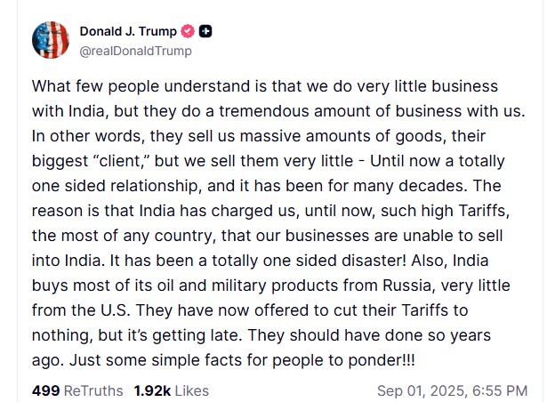 अमेरिकी राष्ट्रपति डोनाल्ड ट्रंप ने ट्रुथ सोशल पर पोस्ट करते हुए कहा, "बहुत कम लोग यह समझते हैं कि हम भारत के साथ बहुत कम व्यापार करते हैं, जबकि वे हमारे साथ बहुत ज्यादा व्यापार करते हैं। दूसरे शब्दों में, वे हमें भारी मात्रा में सामान बेचते हैं, जो उनका सबसे बड़ा ग्राहक है, लेकिन हम उन्हें बहुत कम बेचते हैं।"