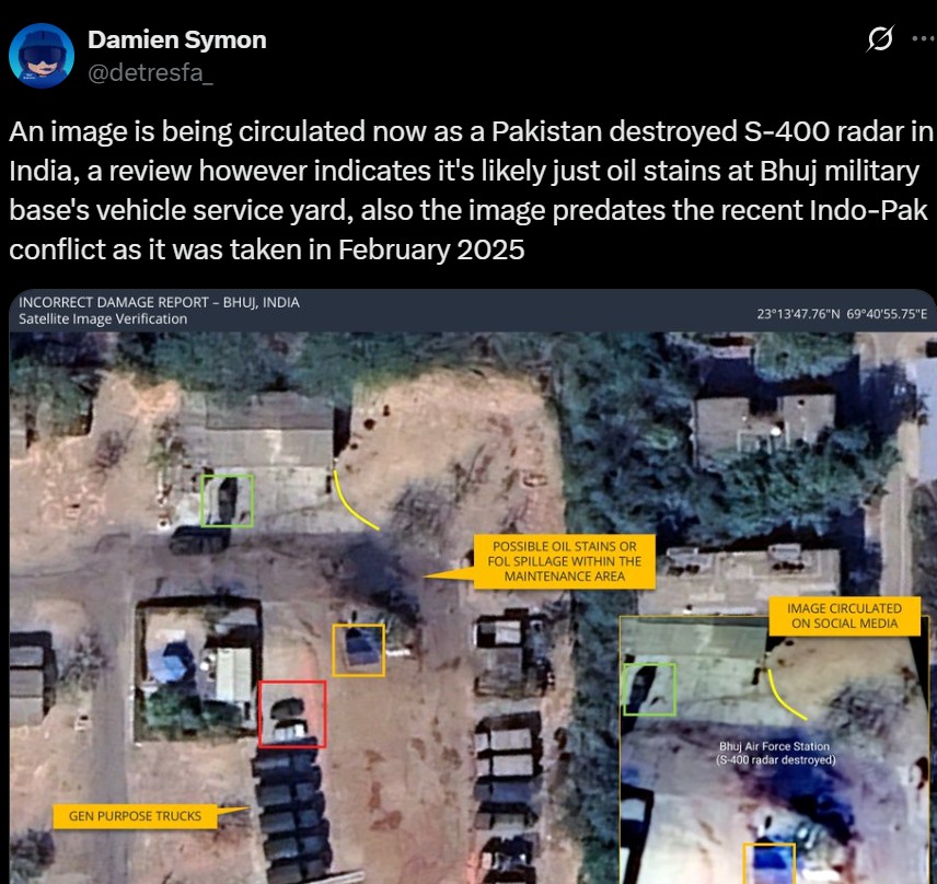 - भुज में भारतीय एस-400 रडार सिस्टम को नष्ट करने का दावा करते हुए एक और तस्वीर प्रसारित की गई।