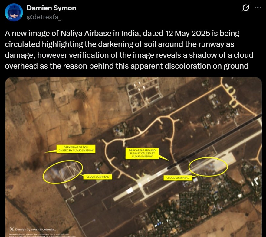 - विश्लेषण से पता चला कि कथित नुकसान ऊपर के बादल की छाया थी। एअरबेस का बुनियादी ढांचा पूरी तरह से अछूता रहा।