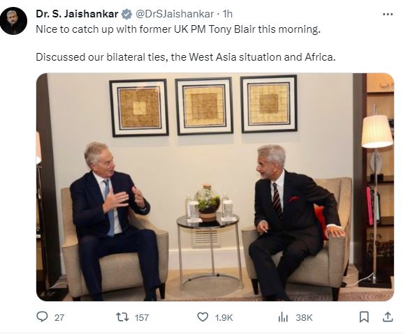 जयशंकर ने सोशल मीडिया एक्स पर एक पोस्ट में कहा, "आज सुबह ब्रिटेन के पूर्व प्रधानमंत्री टोनी ब्लेयर से मिलकर अच्छा लगा। हमारे द्विपक्षीय संबंधों, पश्चिम एशिया की स्थिति और अफ्रीका पर चर्चा हुई।"